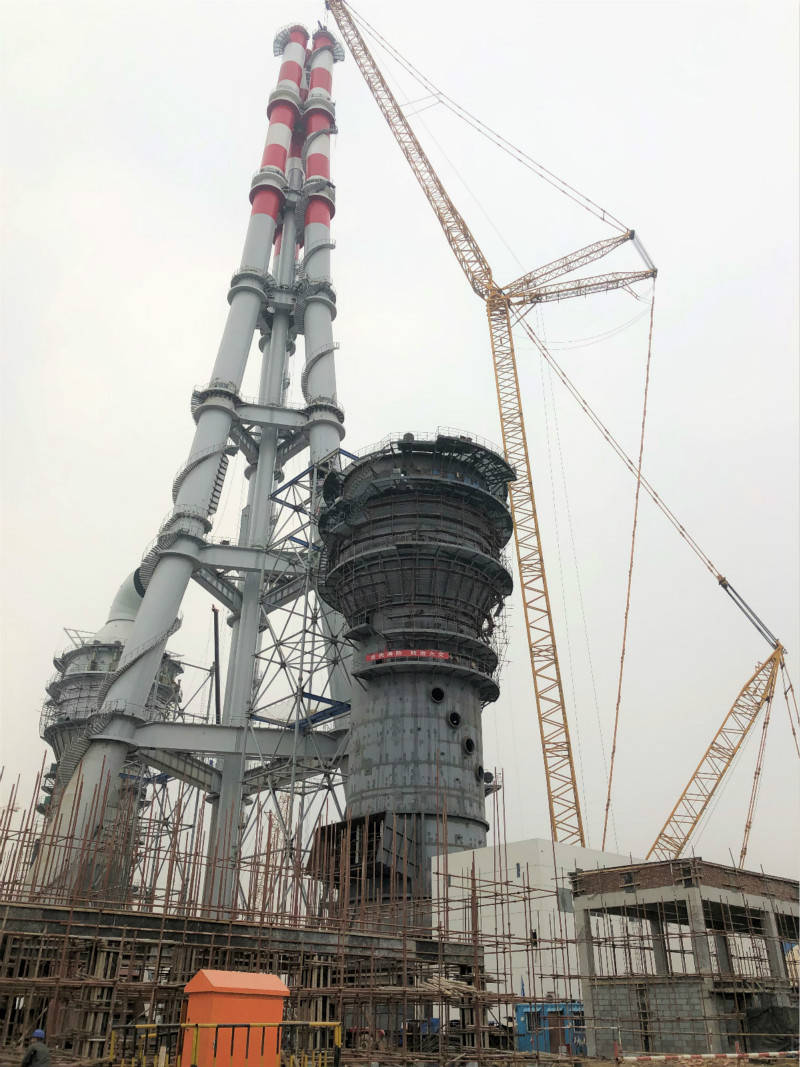 項目配套的三管自立式鋼煙囪,是國能中電引進日本三菱多管自立煙囪技術(shù),并整合了日本鈦板貼襯技術(shù)建設(shè)而成,煙囪內(nèi)徑4.5米,高度180米,分7層,總重2108t。三管自立式鋼煙囪結(jié)構(gòu)合理、造型美觀。三根鋼管煙囪按正三角形布置,通過三角形鋼梁進行剛性連接,形成集束式穩(wěn)定結(jié)構(gòu),每個煙囪由多個直段拼接成流線型曲線。通過整體空間結(jié)構(gòu)來共同抵抗地震荷載、風(fēng)荷載及其它荷載,整個煙囪結(jié)構(gòu)形體規(guī)則,各向受力均勻,造型簡潔、美觀,全面融入了現(xiàn)代氣息和建筑美學(xué)的設(shè)計理念。自2018年8月12日開始施工建設(shè),采用SCC9000/900噸履帶式起重機分七段進行吊裝,在參建各方的共同努力下,歷時135天,于2018年12月25日順利吊裝到頂。