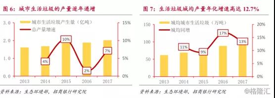 生活垃圾方面,2017年全國2017 年全年我國202個大、中城市生活垃圾產(chǎn)生量為2.02億噸,同比增長7.1%;城市平均產(chǎn)量約為100萬噸,同比增長13%,近5年來城市平均生活垃圾產(chǎn)量的增速已高達12.7%,相關(guān)市場人士預(yù)計2018至2020年我國城鎮(zhèn)生活垃圾產(chǎn)量分別可達到4.1億噸、4.6億噸、5.2億噸,倘若將鄉(xiāng)村生活垃圾合并考慮,2018年至2020年我國生活垃圾總產(chǎn)量分別達到4.8億噸、5.4億噸、6.1億噸。